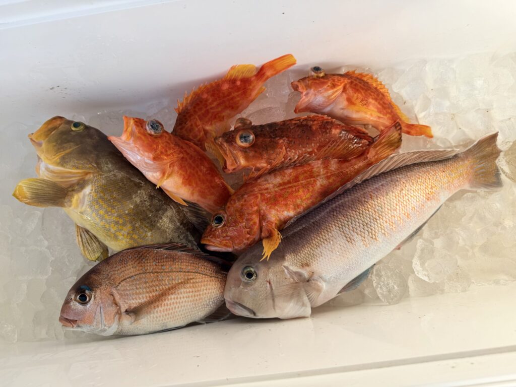 流石に潮が飛びすぎなんで少し浅いポイントへ移動して流し直し、幾分か潮も緩くなって巻き巻き開始です。風も潮もあるのでタイラバも飛んで良い感じですがなかなかアタリは出ず、たま〜に当たるのはアヤメカサゴwこの後風が落ちる予報なんで朝釣らないとヤバイ!!と集中して巻き続けるも段々と風も落ちて来て、同じく潮も緩んでバーチカル地獄に突入(泣)